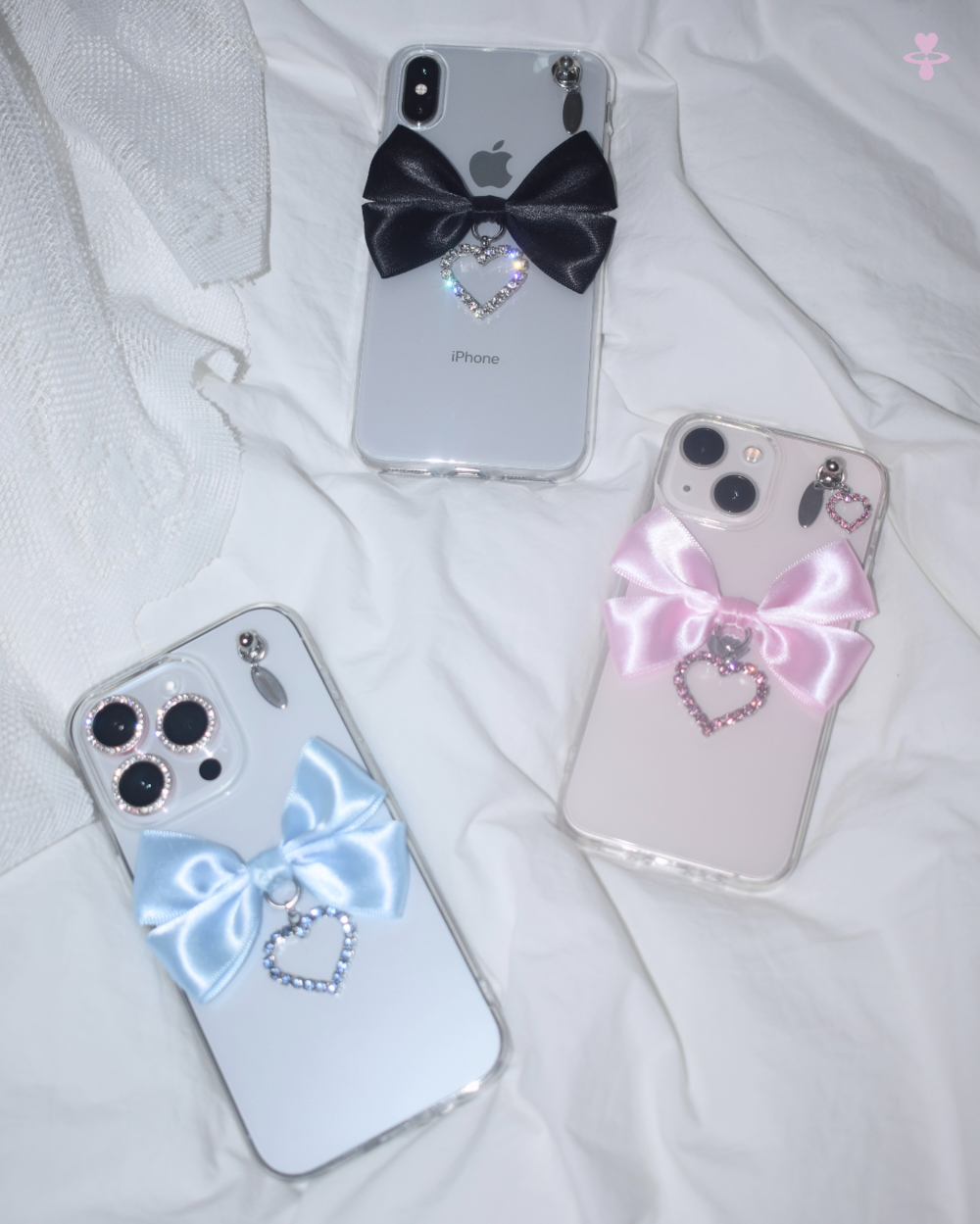 ❤︎ 사진 속 핑크 케이스의 우측 상단에있는 MINI HEART PENDANT 는 옵션에서 추가로 구매가능합니다.